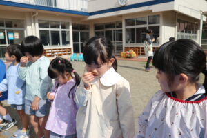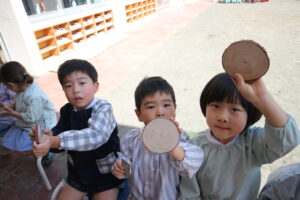 コースター作りでは、ヒノキの木をやすりがけしました。「先生触ってみて!ツルツルでしょ!」と子どもたちからの声や、友達ともお話しながら楽しむ様子がみられました。