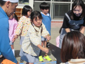 クラスのみんなで木の皮を剥ぎ、大きなノコギリを使って友達と協力して切る体験をしました。初めは難しかったけれど、徐々に慣れた様子で大工さんのようでしたね。