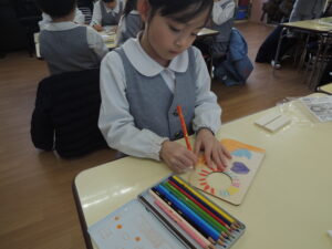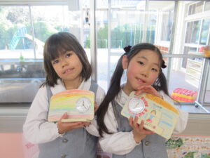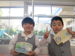 木の板に色鉛筆で年長組の思い出になるような絵を描き、素敵な時計が完成しました。