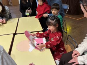 最初は、鈴を持って「トナカイのクリスマス 」のゲームも挑戦しました。元気いっぱい音楽にあわせて鈴を鳴らし、楽しむ様子にほっこりしました。
