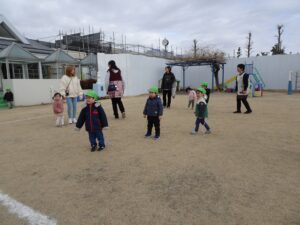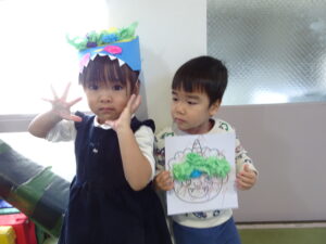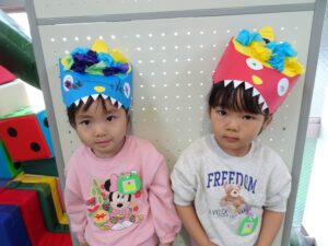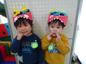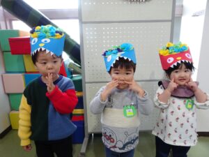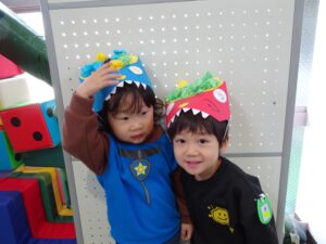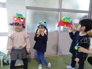 お迎えの時間になると、自分たちで作った鬼の帽子をお家の方に見せたいとかわいい鬼に変身してお迎えを待っていました。