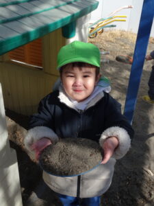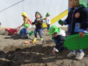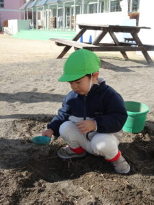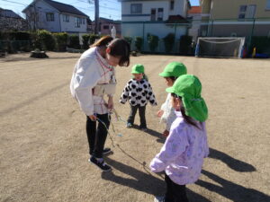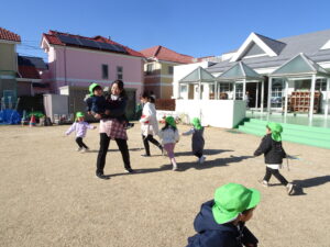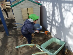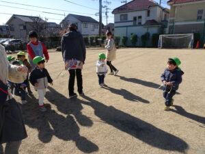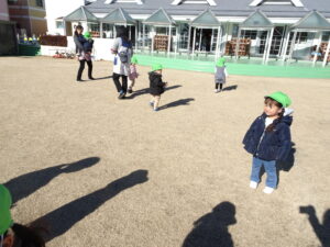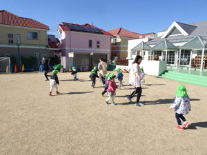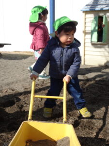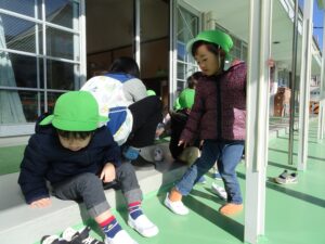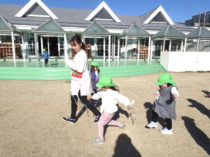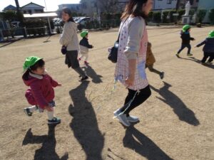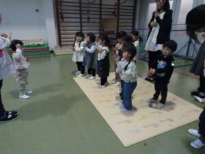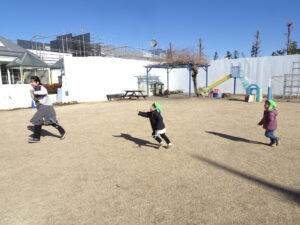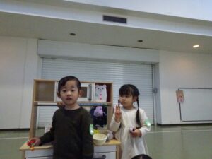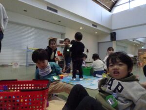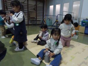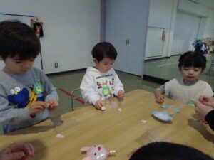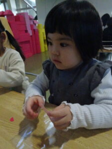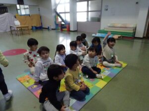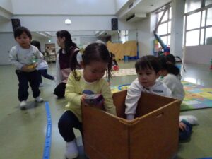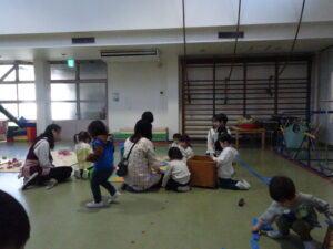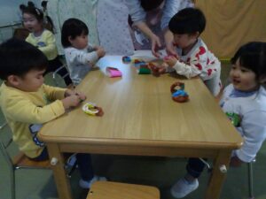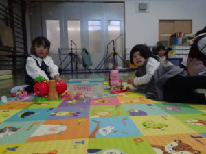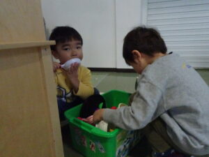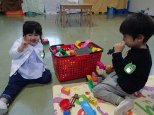 お家の方との完全分離に挑戦しました。登園時にお預かりするときに泣いていた子も、お部屋で先生とお話したり、お友達がおもちゃで遊んでいる姿を見るうちに泣くことを忘れ遊びはじめていました。