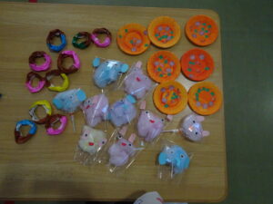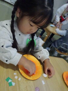 製作では、お店屋さんごっこの商品「ピザ・綿あめ・ドーナツ」を作りました。