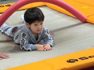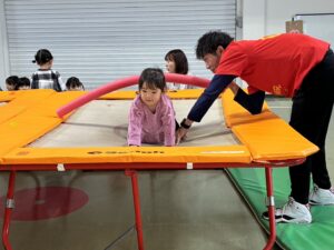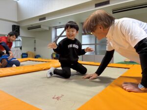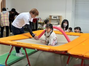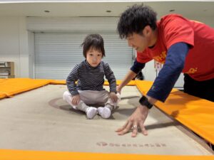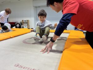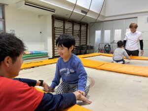 体育館に移動して、大きなトランポリンを前に子どもたちは興味深々でした。