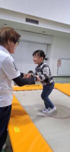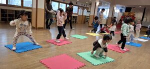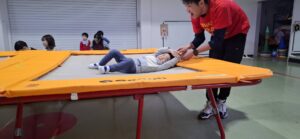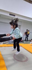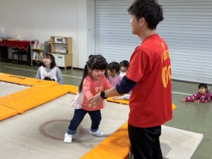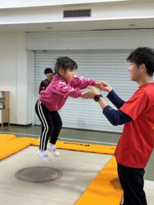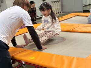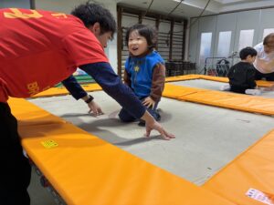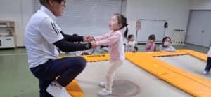 今日の保育は、「体育」の専任の先生に来ていただき『トランポリン』を体験しました。