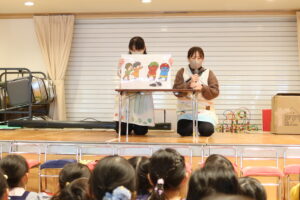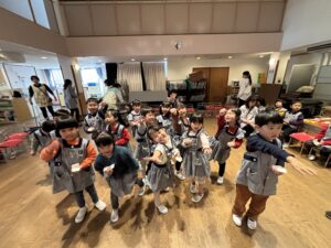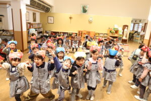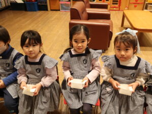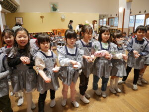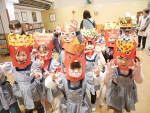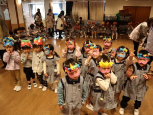 鬼役と豆をまく役に分かれました。子どもたちが作った鬼のお面はそれぞれの個性が表現されていて、世界に一つしかないお面でした。