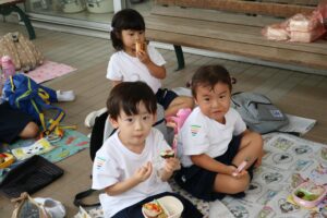年少組は、幼稚園に戻ってお弁当とおやつを食べました。