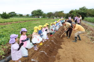 気持ちのいい秋晴れの中、子ども達が楽しみにしていた「芋ほり遠足」にいってまいりました。